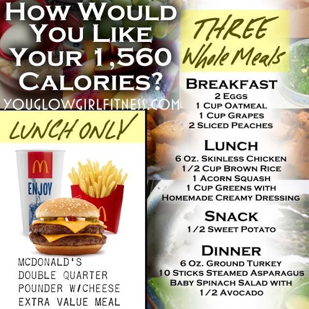 We go to fast food because it’s convenient. I get it. Really, I do. I know that sometimes we’re just way too tired to cook and well, fast food is just that – fast. And I’ve heard it all “fast food is cheaper.” But is it, really? Calorie for calorie, it truly is more expensive. If I told you that one meal from a famous fast food restaurant is the equivalent to 1,560 calories and that you could actually consume 1,560 calories in one day, by cooking healthy food that’s actually GOOD for you, which would you choose? Do you know how many calories is in a fast food meal?